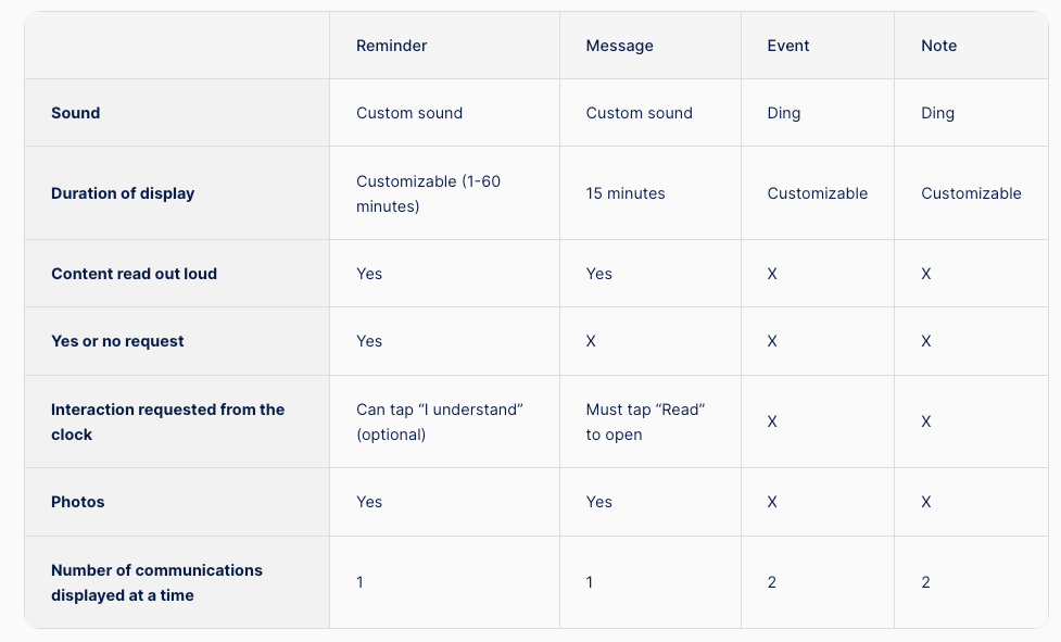 Types of communicationUpdated 8 months agoThe Idem Clock offers four types of communications designed to help caregivers and family members stay connected and updated. Here’s a summary of the types of communications and their functions: Was this article helpful? YesNo